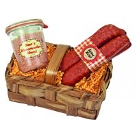 Artikel-Nr: F146407522 Paar deftige Feine-Kost Landjäger, herzhaft geräuchert, 160 g. 1 Glas würziges Bauernfrühstück. Hausmacher Wurst im Original-Weckglas nach altbewährtem Rezept, 125 g. Verpackt in Geschenkfolie mit Schleife.