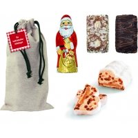 Artikel-Nr: F14640790VE 6 Stück. 1 Elisenlebkuchen mit Mandel, 50 g. 1 Elisenlebkuchen mit Schokolade, 50 g. 1 Gourmet-Christstollen, 80 g. 1 Schokoladen-Weihnachtsmann, 25 g. Verpackt in hochwertigem Baumwollsäckchen mit Kordel.