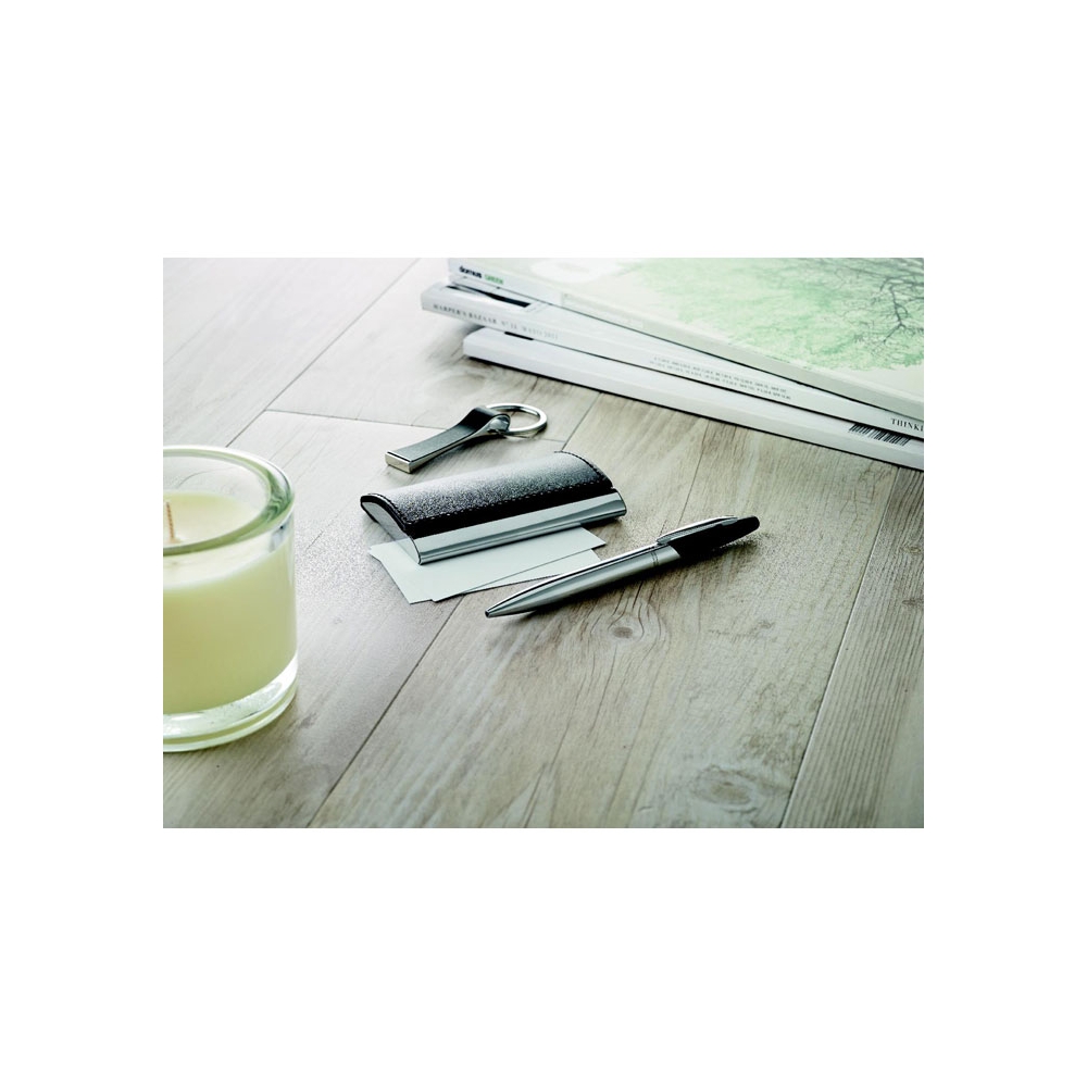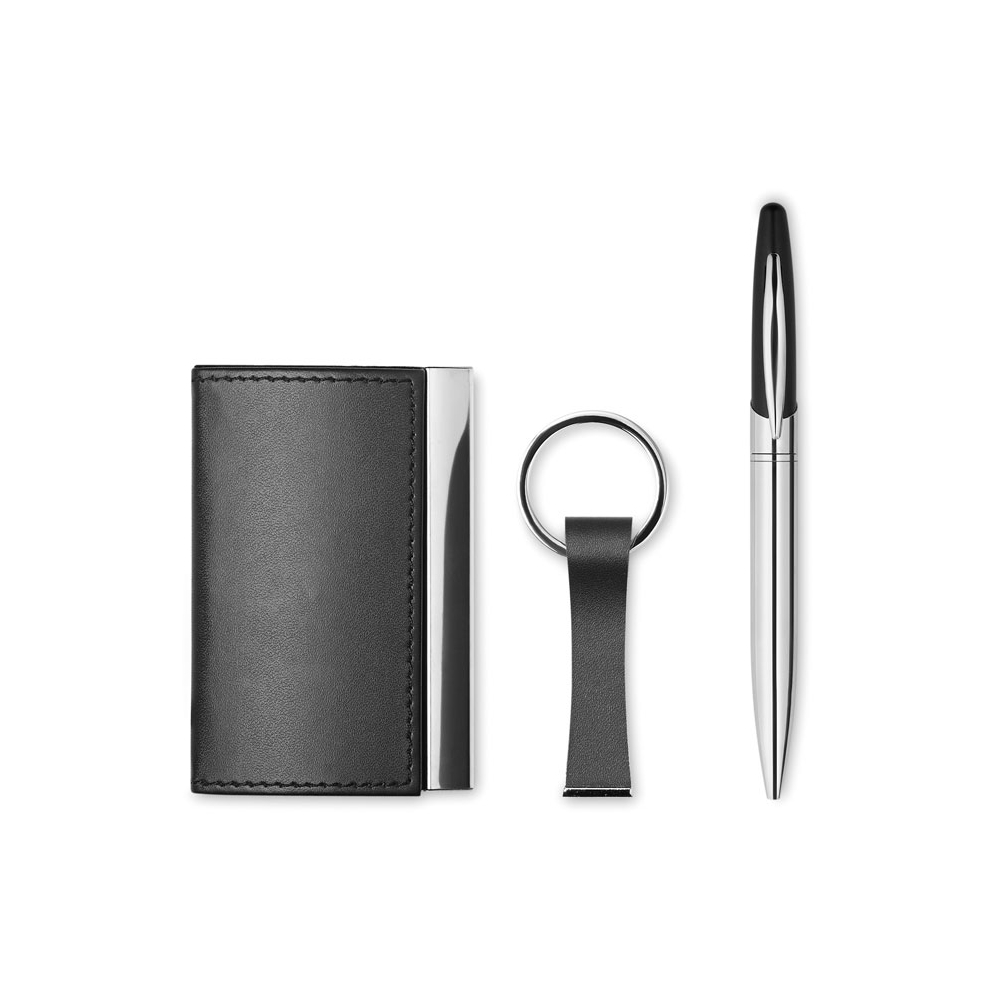 Artikel-Nr: OCBMO8406-03Business-Set mit Drehkugelschreiber, Visitenkartenhalter und Schlüsselanhänger aus einer Zinklegierung / PU Kombination. Verpackt in einer Geschenkbox. Schwarze Tinte.