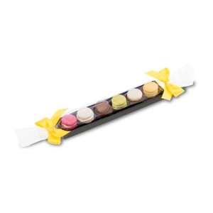 Artikel-Nr: ROP2K1695Ostern ist bunt und lecker: Überraschen Sie mit dieser fröhlichen Gebäck-Stange als Alternative zur klassischen Schokolade. Sechs gemischte Confiserie-Macarons (60 g) im Blister, dekoriert mit einem gelben Schleifenclip auf jeder Seite.