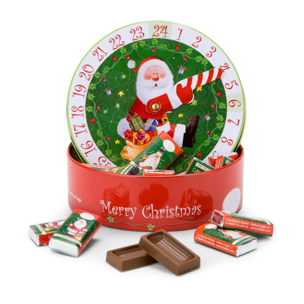 Artikel-Nr: ROP2K2070Diese Dose ist eine originelle Adventskalender-Uhr: jeden Tag kann der Zeiger auf dem Dosendeckel eine Ziffer weiter wandern und Sie dürfen eine der 24 Edel-Vollmilch Schokoladen-Täfelchen (je 3 g) genießen. So vergeht die Zeit bis zum Fest wie im Flug!