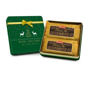 Artikel-Nr: ROP2K2100Dominosteine sind ein klassisches Weihnachtsgebäck. Diese hübsche, quadratische Metalldose mit gebundener Goldschleife ist gefüllt mit gleich 20 kleinen Meisterwerken, überzogen mit edler Zartbitterschokolade (250 g). Die Dose, die danach mit anderen weihnachtlichen Leckereien gefüllt werden kann, wünscht "Merry Christmas and a Happy New Year".