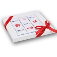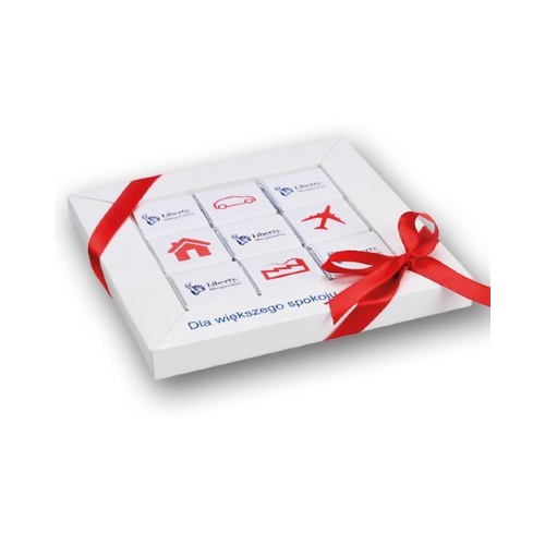 Artikel-Nr: W965S0088Neun zarte Schokoladenquadrate in einer ansprechenden Geschenkbox mit Schleife. Genuss zum Verschenken