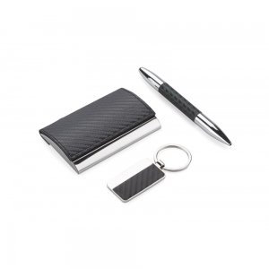 Artikel-Nr: ARD17549Elegantes Geschenkset. Visitenkartenetui, Schlüsselanhänger und Kugelschreiber. Gepackt in eine schwarze Box. Das Logo wird auf dem Schlüsselanhänger graviert oder auf dem Visitenkartenetui aufgedruckt.