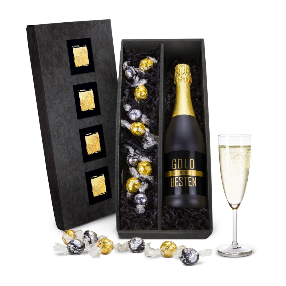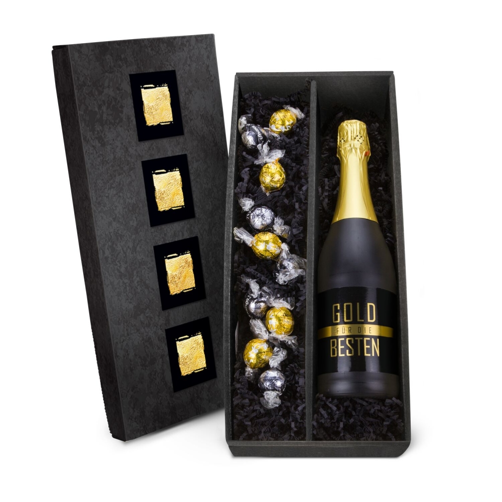 Artikel-Nr: ROP2K1348Goldene Momente "für die Besten" oder andere wertvolle Menschen! Verschenken Sie einen hochwertigen Sekt in matt-schwarzer Flasche (Villa Römer Cuvée 0,75 l) kombiniert mit 5 goldenen und 5 schwarzen Lindt Lindor-Kugeln (ca. 125 g). Dabei ist Schwarz und Gold eine edle Kombination, die Ihre Wertschätzung ideal zum Ausdruck bringen wird. Das Set wird abgerundet durch schwarzes Sizzle und einen schwarzen Karton mit goldener Prägung.