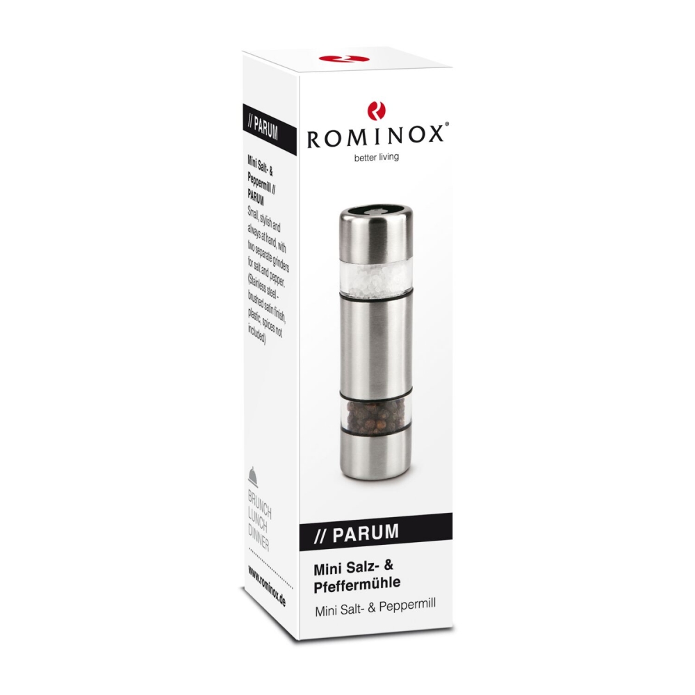 Artikel-Nr: ROP2K2045oSalz & Pfeffer im Miniformat - klein, fein und immer griffbereit - die ROMINOX® Mühle mit zwei getrennten keramischen Mahlwerken für Salz und Pfeffer ist direkt kombiniert mit je einem kleinen Gläschen Salz (ca. 40 g) und Pfeffer (ca. 20 g) - einfach einfüllen und auf den Tisch stellen. Verpackt ist das Set in einem gelben Geschenkkarton.