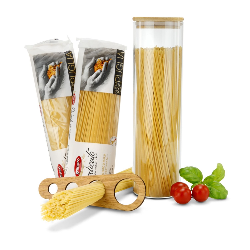 Artikel-Nr: ROP2K2082Buon appetito! Unser Spaghetti-Geschenkset enthält fast alles, was Sie für eine köstliche italienische Mahlzeit zuhause benötigen: 2 Packungen Spaghetti (je 500 g) al bronzo, ein praktisches Spaghettimaß mit 4 Größen, ein modernes ROMINOX® Spaghettiglas mit Bambusdeckel (für mind. 1 kg). Auf der Rückseite des Glas-Einlegers befinden sich 3 köstliche Spaghetti-Rezepte: Spaghetti Aglio e Olio, al Arrabbiata und Carbonara. So bringen Sie den Geschmack Italiens zu sich nach Hause. Auf Wunsch auch mit individuellem Einleger.