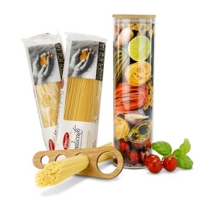 Artikel-Nr: ROP2K2082Buon appetito! Unser Spaghetti-Geschenkset enthält fast alles, was Sie für eine köstliche italienische Mahlzeit zuhause benötigen: 2 Packungen Spaghetti (je 500 g) al bronzo, ein praktisches Spaghettimaß mit 4 Größen, ein modernes ROMINOX® Spaghettiglas mit Bambusdeckel (für mind. 1 kg). Auf der Rückseite des Glas-Einlegers befinden sich 3 köstliche Spaghetti-Rezepte: Spaghetti Aglio e Olio, al Arrabbiata und Carbonara. So bringen Sie den Geschmack Italiens zu sich nach Hause. Auf Wunsch auch mit individuellem Einleger.