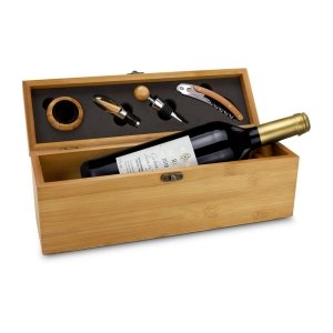 Artikel-Nr: ROP2K1330Eine hochwertige Bambuskiste mit edlen Weinaccessoires von ROMINOX® für einen guten Rotwein: Korkenzieher, Flaschenverschluss, Ausgießer und Tropfring, jeweils mit Bambuselementen. Dazu eine Flasche 0,75 l klassischer Cabernet Sauvignon mit hochwertiger Goldfolienprägung.