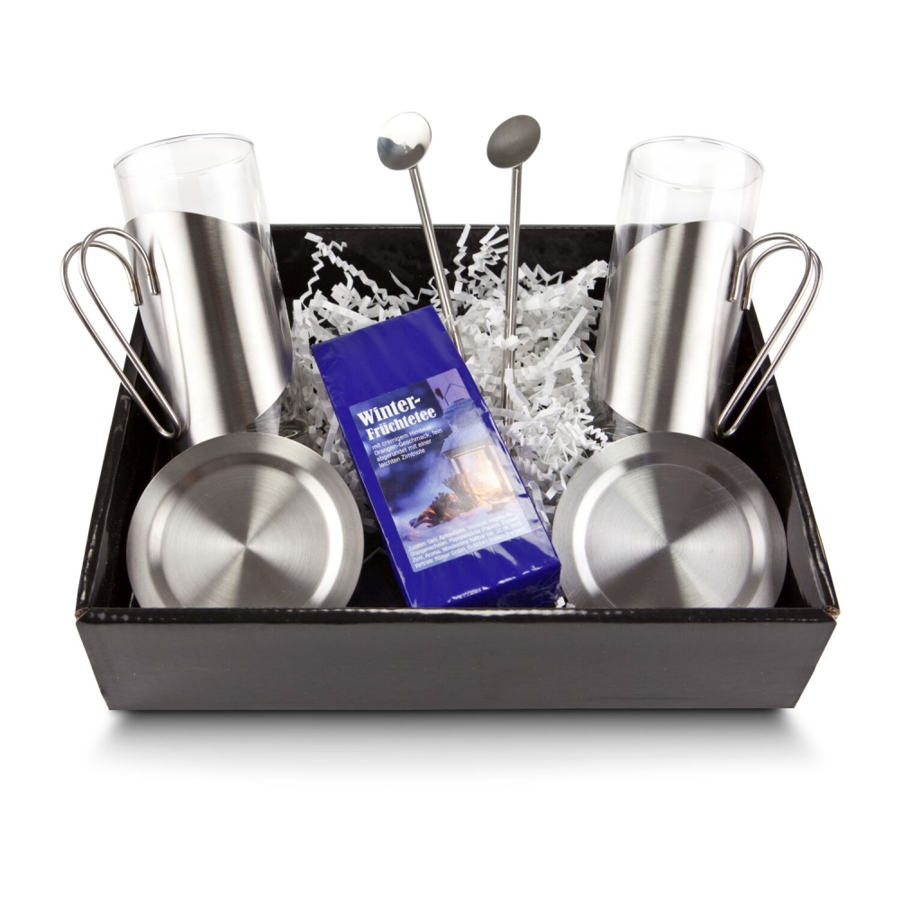 Artikel-Nr: ROP2K1400Teegenuss zur Winterzeit! Aus den 2 langen, schlanken Teegläsern (mit Untersetzern und Trinkhalmlöffeln) schmeckt der gleich mitgelieferte Winter-Früchtetee (50 g) besonders gut. Verpackt sind alle Teile in einem schwarzen Karton mit transparentem Deckel und winterlich-weißem Sizzle.