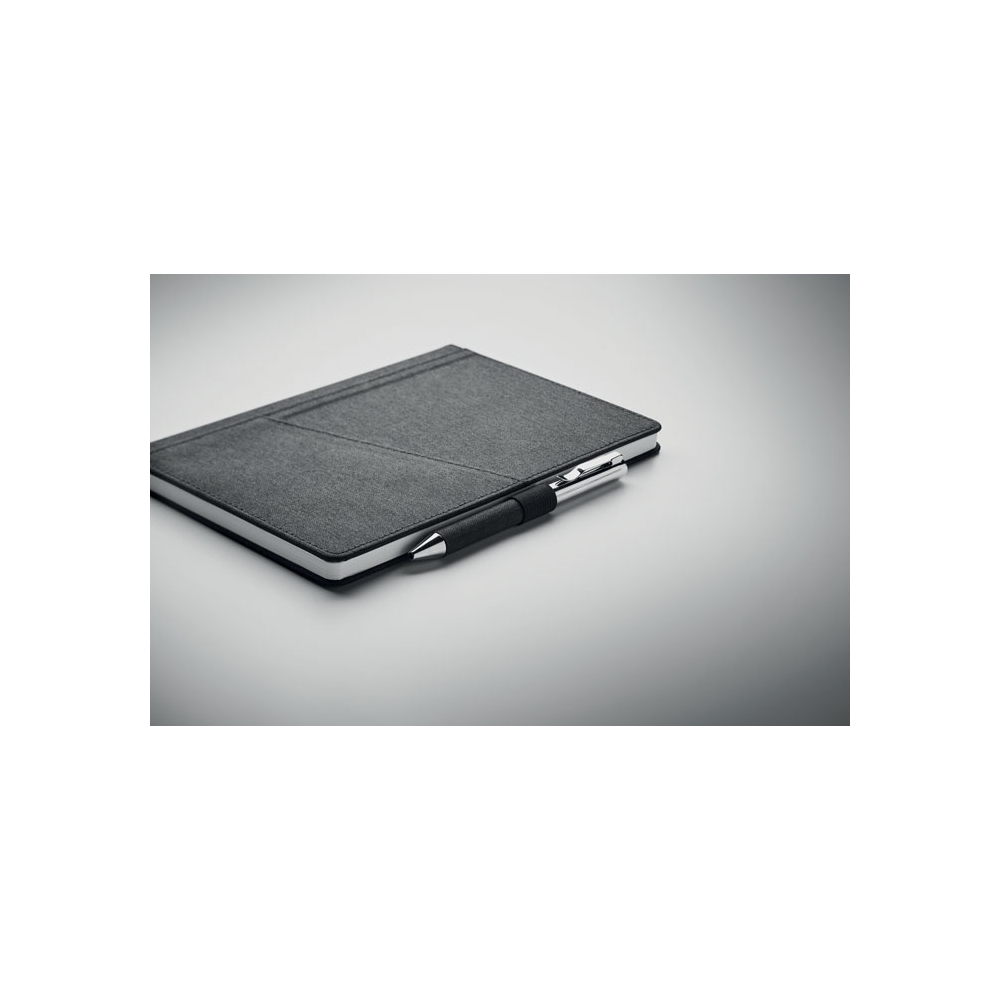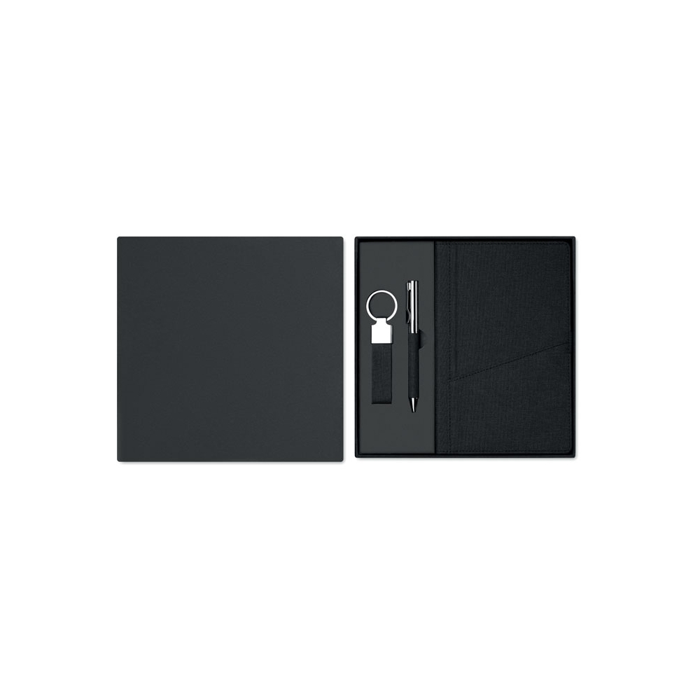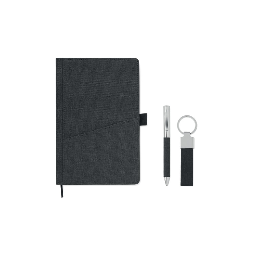 Artikel-Nr: OCBMO2335-033-teiliges Geschenkset in Geschenkbox. Inkl. Drehkugelschreiber aus Metall mit Details aus RPET-Polyester, Notizbuch mit Smartphone-Fach und Schlüsselring aus RPET-Polyester. Blaue Tinte. FSC MIX CREDIT | P7.1 | FSC-C213206
