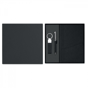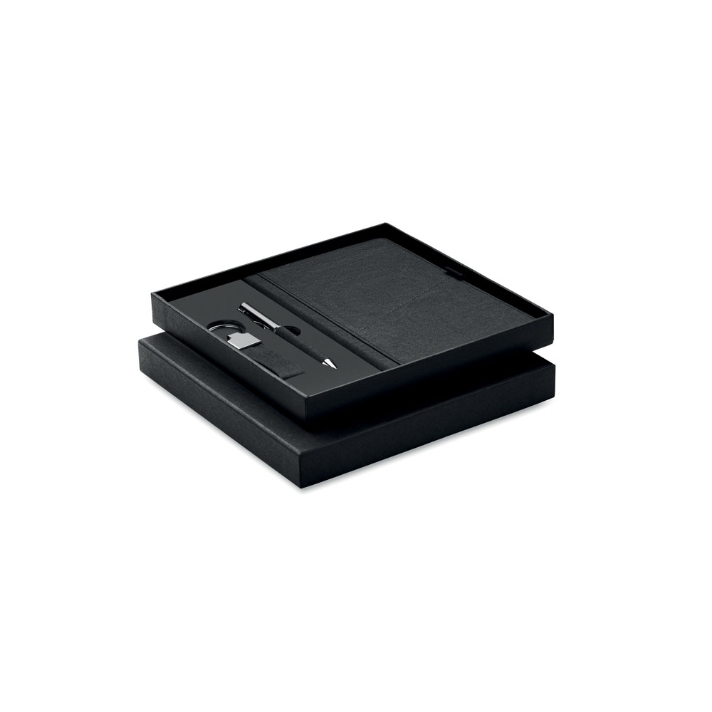 Artikel-Nr: OCBMO2335-033-teiliges Geschenkset in Geschenkbox. Inkl. Drehkugelschreiber aus Metall mit Details aus RPET-Polyester, Notizbuch mit Smartphone-Fach und Schlüsselring aus RPET-Polyester. Blaue Tinte. FSC MIX CREDIT | P7.1 | FSC-C213206
