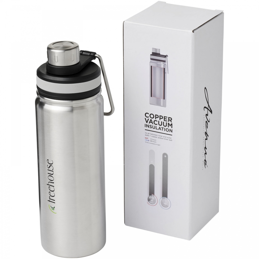 Artikel-Nr: CPO10064418Doppelwandige Edelstahl-Vakuumkonstruktion mit Kupferisolierung, welche dafür sorgt, dass Ihr Getränk mindestens 12 Stunden lang heiß und 48 Stunden lang kalt bleibt. Die Konstruktion verhindert auch eine Kondensation an der Außenseite der Flasche. Ausgestattet mit einem Schraubverschluss und einem Edelstahldeckel mit einem praktischen Tragegriff. Konstruktion mit zwei Öffnungen für einfache Reinigung und Befüllung. Das Fassungsvermögen beträgt 590 ml. Präsentiert in einer Avenue-Geschenkschachtel.