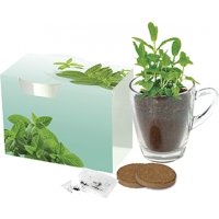 Artikel-Nr: 449001313Eine formschöne Tasse aus Glas, in der Gesundheit und Wellness wachsen kann. Einfach die Erdtabletten mit Wasser aufquellen lassen, die Pfefferminz-Samen einstreuen und schon bald wächst die gesunde Pflanze. Die Pfefferminz-Blätter sind hervorragend für einen wohltuenden Teeaufguss geeignet. Die umlaufende Banderole bietet im Standardmotiv viel Platz für Ihre Werbebotschaft ab 250 Stück. Eine individuelle Gestaltung ist ebenfalls ab 250 Stück möglich.