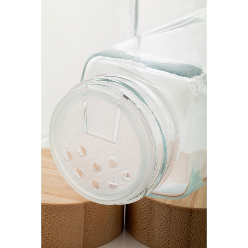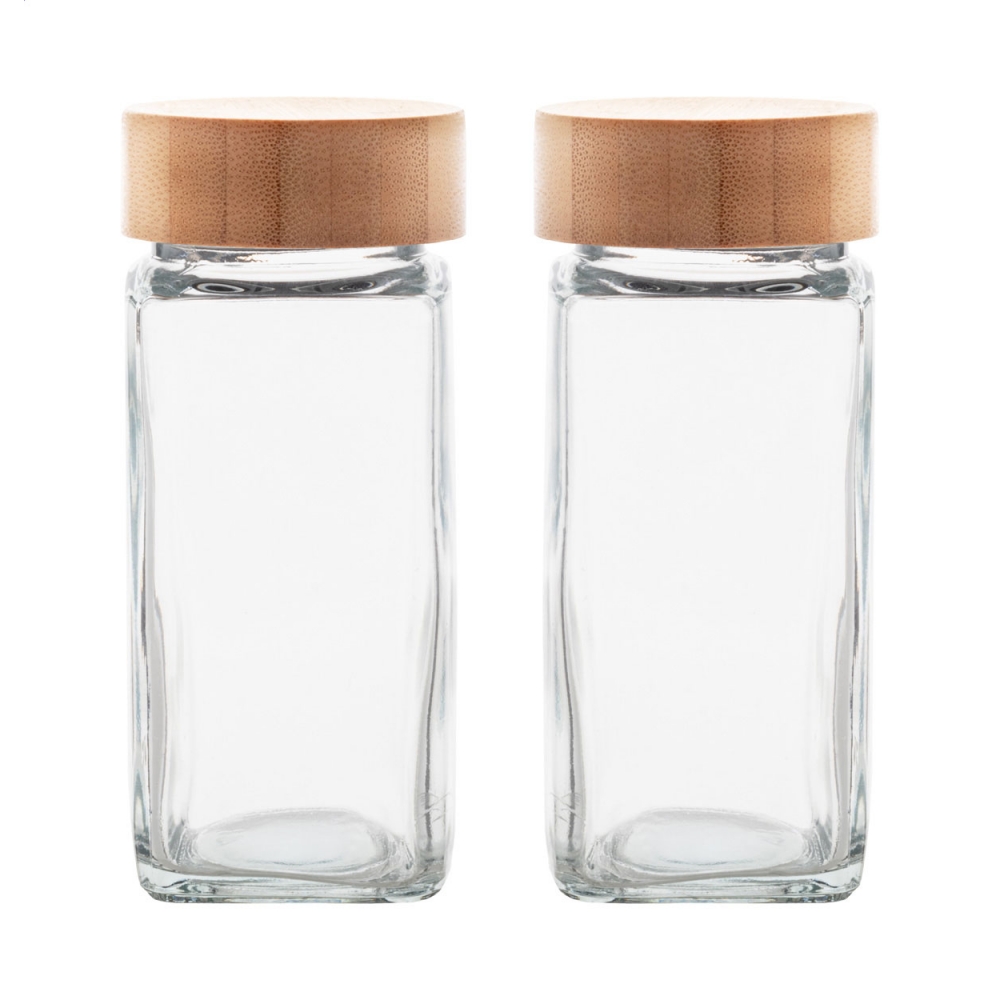 Artikel-Nr: AND8005672-teiliges Gewürzbehälterset aus Glas mit Bambusdeckeln. Füllmenge: 120 ml. Verpackt in Kraftpapierbox.