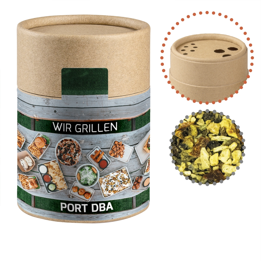 Artikel-Nr: FNM01557Kraftpapierstreuer Midi aus Papier. Werbeanbringung als Etikett in 4c individuell bedruckbar. Zutaten Gewürzmischung Steakgewürz: Pfeffer, Salz, Zwiebeln, Paprika, Säuerungsmittel: Zitronensäure E 330; Schnittlauch, Petersilie, Rapsöl, Karotten, Pastinaken, Dill, Liebstöckel.