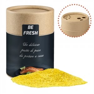 Artikel-Nr: FNM01551Kraftpapierstreuer Midi aus Papier. Werbeanbringung als Etikett in 4c individuell bedruckbar. Zutaten Gewürzmischung Zitronen-Salz: Salz, Kurkuma, Zitronenöl, Zitronenschale.