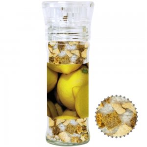 Artikel-Nr: FNM00844Transparente Gewürzmühle aus Glas. Werbeanbringung als Etikett in 4c individuell bedruckbar. Zutaten Gewürzmischung Zitronen-Salz: Salz, Kurkuma, Zitronenöl, Zitronenschale.