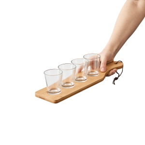 Artikel-Nr: INP56-0304454Gläser-Set BAMBOO PARTY: 4 Schnapsgläser (je 6 cl) auf Bambus-Holzbrett, Vertiefungen im Tablett geben den Schnaps-Gläsern einen sicheren Halt, mit Aufhängeband aus Leder, in Box