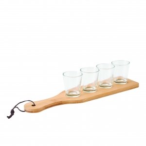Artikel-Nr: INP56-0304454Gläser-Set BAMBOO PARTY: 4 Schnapsgläser (je 6 cl) auf Bambus-Holzbrett, Vertiefungen im Tablett geben den Schnaps-Gläsern einen sicheren Halt, mit Aufhängeband aus Leder, in Box