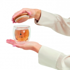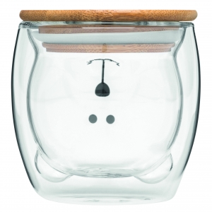 Artikel-Nr: INP56-0304508Glas BAMBOO BEAR, doppelwandig: Bambusdeckel mit Silikon-Dichtring, transparent, temperaturbeständig, Bärengesichtsform, Füllmenge ca. 250 ml, in Box