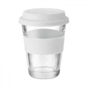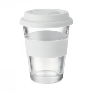 Artikel-Nr: OCBMO9992-06Trinkbecher aus Glas mit Silikon-Deckel und -Griff. Füllmenge: 350 ml. Da der einwandige Becher die Hitze nach außen leiten kann, kann der Artikel heiß werden.