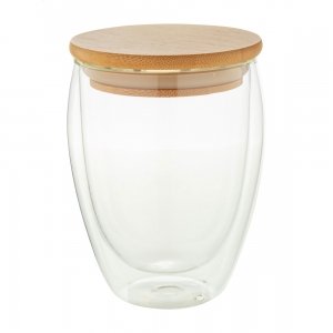 Artikel-Nr: AND812425Doppelwandiger Thermobecher aus Borosilikatglas mit Bambusdeckel. Füllmenge: 320 ml. Einzeln in Kraftpapierbox.