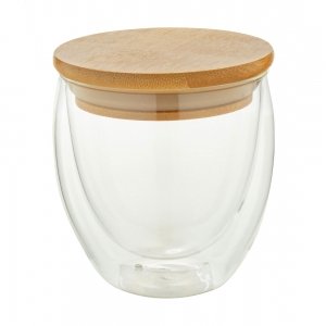 Artikel-Nr: AND812424Doppelwandiger Thermobecher aus Borosilikatglas mit Bambusdeckel. Füllmenge: 300 ml. Einzeln in Kraftpapierbox.