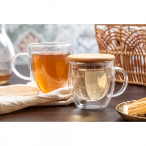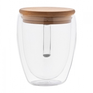 Artikel-Nr: AND800443Doppelwandige Thermotasse aus Borosilikatglas mit Henkel und Bambusdeckel. Füllmenge: 350 ml. Einzeln in Kraftpapierbox.
