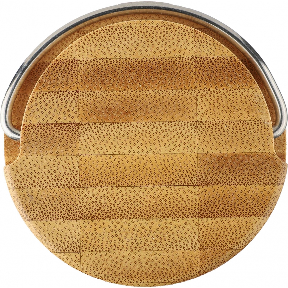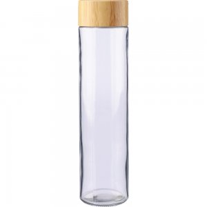 Artikel-Nr: GIV1171298011Trinkflasche aus Glas (500 ml) mit Bambusdeckel und Tragegriff aus Metall. Einzeln verpackt in einer braunen Pappschachtel.