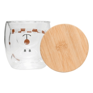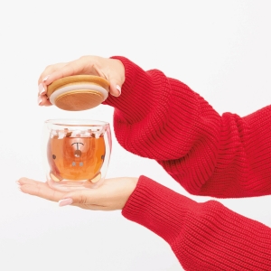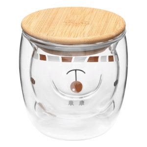 Artikel-Nr: INP56-0304509Glas XMAS BEAR, doppelwandig: Bambusdeckel mit Silikon-Dichtring, transparent, temperaturbeständig, Bärengesichtsform mit brauner Nase und Schal, Füllmenge ca. 250 ml, in Box
