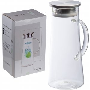 Artikel-Nr: MCM8079866Glaskaraffe mit Verschlussdeckel aus Edelstahl und einem Füllvermögen von 1.350ml. Der Verschluss hat 2 verschiedene Öffnungen, eine Sieb- und eine große Öffnung. Ihre Werbung lasern wir auf den Deckel.