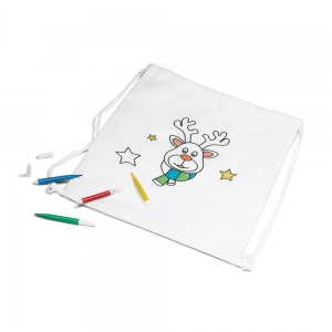 Artikel-Nr: PST92621-106Turnbeutel zum Ausmalen aus Non-Woven (80 g / m²) mit Ausmalbildern und Innentasche. 4 Filzstifte enthalten. 300 x 350 mm