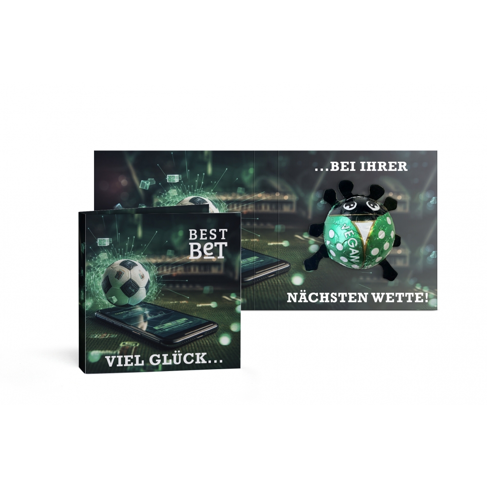 Artikel-Nr: MGN07050-0001Ein Glücksbringer zum Vernaschen in veganer Qualität überrascht alle Vollmilchschokoladen-Fans: zartschmelzender Genuss, der sich geschmacklich von gewohnter Vollmilchschokolade kaum unterscheiden lässt. Der Käfer kommt in einer rundum veredelbaren Werbeklappkarte aus FSC®-zertifiziertem Karton.
