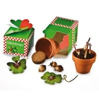 Artikel-Nr: W624SchachtGlück kann man immer schenken, nicht nur zu Silvester und Neujahr! Mit diesem attraktiven Werbeartikel verschenken Sie das garantierte Glück, denn nur aus den Oxalis-Zwiebeln entstehen 4-blättrige Glückskleeblätter. In der werbewirksamen Rosettenschachtel (Format: 52 x 52 x 42 cm) steckt ein Tontopf mit Erdquellscheibe und 3 Zwiebeln. Werbeeindruck (30 x 20 mm) ist nachträglich auf der