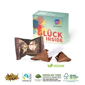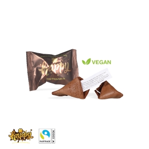 Inhalt: 1 Happy Glückskeks mit leckerem Schokogeschmack und Botschaften, die Herz und Seele erreichen. Fairtrade® zertifizierter Kakao aus kontrolliertem Anbau, laktosefrei, palmölfrei, vegan. 100 % Made in Germany!