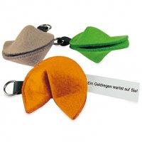 Artikel-Nr: 4011310070In den kleinen Filz-Schlüsselanhängern, in Form eines Glückskekses, können die Werbebotschaften eingelegt werden. Die Standardfarben sind braun, grün und orange (andere Filzfarben auf Anfrage möglich). Der Innenzettel kann individuell in schwarz mit Ihrer Botschaft bedruckt werden, ebenso die Einzelbox, die optional dazu erhältlich ist. Größe: 8 x 5,5 cm (inkl. Anhänger)