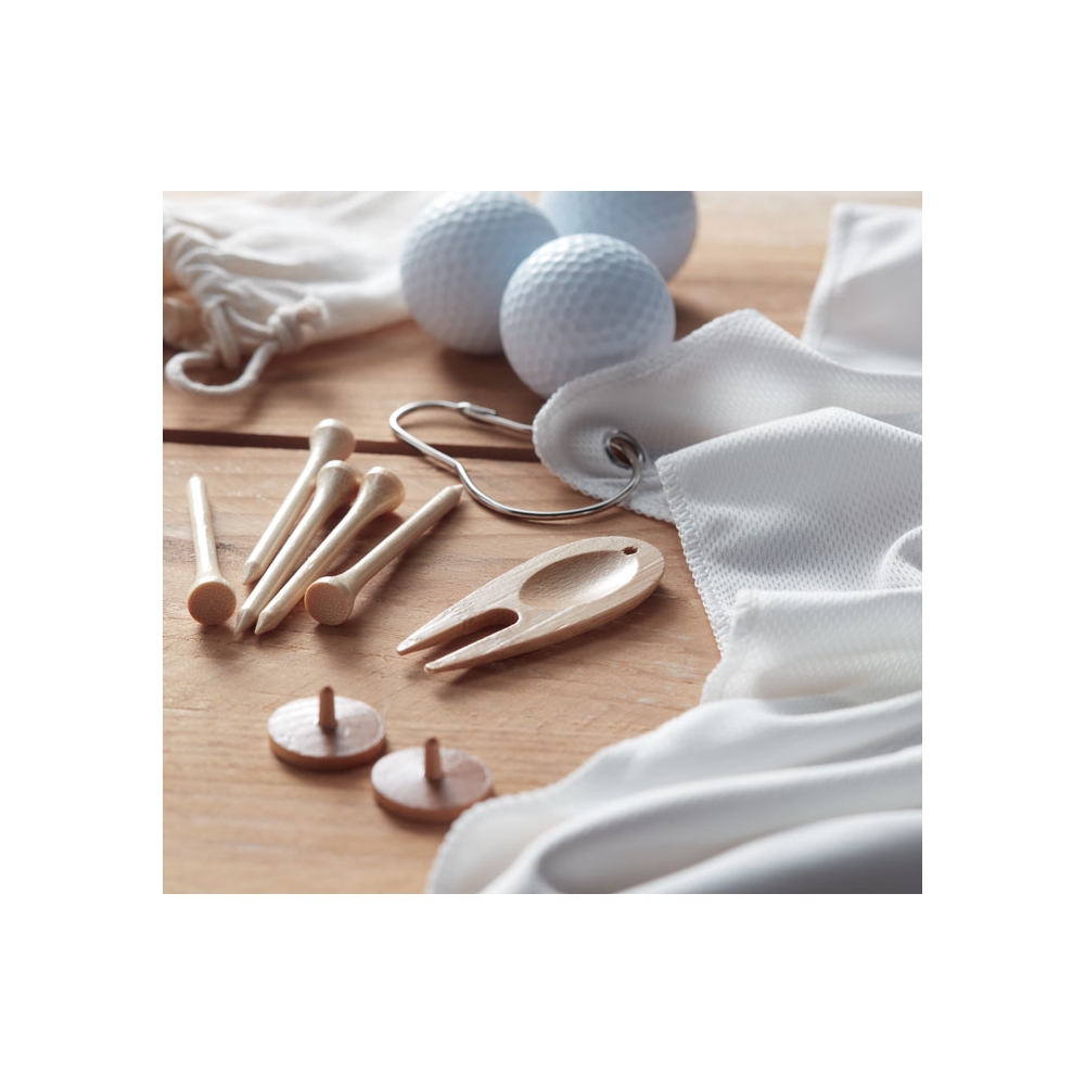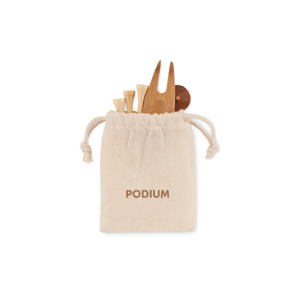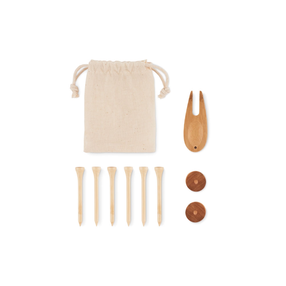 Artikel-Nr: OCBMO6527-13Golfzubehör aus Bambus, bestehend aus 6 Golf Tees, 1 Golf-Pitchgabel und 2 Ballmarkern aus Holz. Inkl. Beutel mit Kordelzug aus Organic Cotton. Bambus ist ein natürliches Produkt, es kann daher zu leichten Abweichungen in Farbe, Dekor und Maßen kommen.