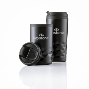 Artikel-Nr: CLP264638-001Doppelwandiger Edelstahl-Thermobecher mit Schraubdeckel und Klicköffnung. PP-Innenwand. Mit auffallendem geometrischem 3D-Rautenmuster im Halter. Rutschfester Boden. Tropfsicher. Nicht spülmaschinengeeignet. Fassungsvermögen 300 ml.