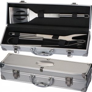 Artikel-Nr: EAG064807TOP PRICE! Grillkoffer bestehend aus Grillzange, Fleischgabel und Grillwender im Metallkoffer. Ihre Werbung lasern wir auf das ovale Metallschild des Koffers.