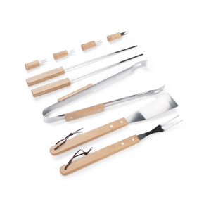 Artikel-Nr: ARD16606-02PANO ist ein 9-Element-Grillset in einer praktischen Tasche mit Reißverschluss, das mit einem verstellbaren Trageriemen ausgestattet ist. Das Set enthält eine kleine Schaufel, eine Gabel, eine Zange, Schaschlikspieße (2 Stück) und Maisgriffe (4 Stück). Griffe aller Elemente sind aus Holz hergestellt.