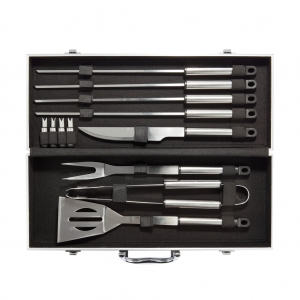 Artikel-Nr: XND42218212tlg. Edelstahl Grillset, inkl. 4 Spießen, Messer, 4 Maiskolbenhalter, Bratenheber, Grillzange und -gabel mit Schutzhülle, Set konfektioniert in Aluminiumkoffer.