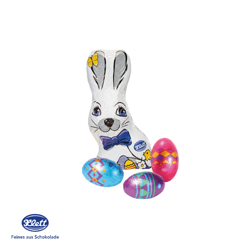 Inhalt: Vollmilch Schokoladenmischung (ca. 58 g), bestehend aus 3 Stück Schokoladen-Eiern, bunt gemischt und einem Osterhasen von Klett.
