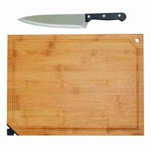 Artikel-Nr: INP58-8030479Großes Schneidebrett BAMBOO SHARP: aus Bambus, inkl. Messer aus Edelstahl mit Holzgriff, im Brett integrierter Messerschärfer aus Keramik, mit praktischer Ablaufrille am Rand und kleinem Loch zum Aufhängen, in Box