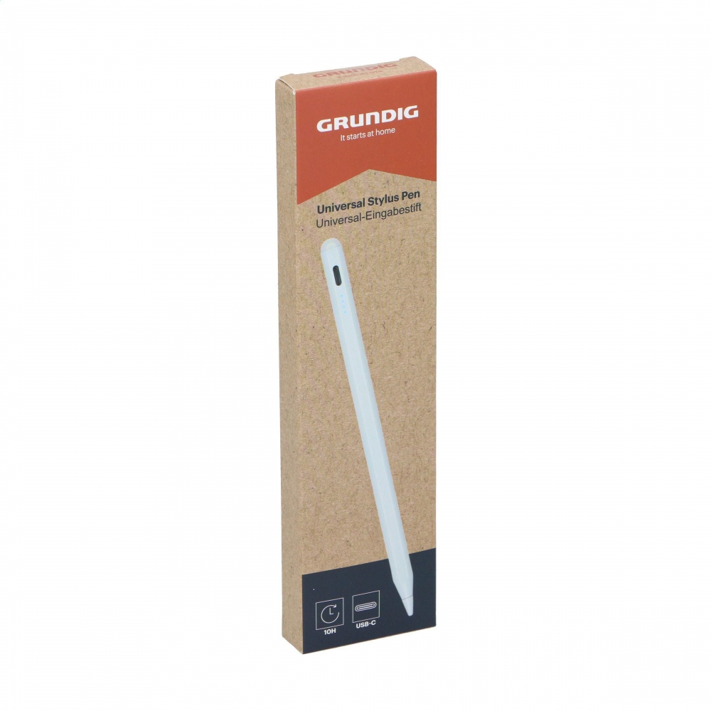 Artikel-Nr: CLP263063-002Leichter Stylus-Stift aus Aluminium der Marke Grundig. Kompatibel mit Tablets, Smartphones und anderen Geräten mit Touchscreen. Vielseitig einsetzbar zum Schreiben, Zeichnen, Tippen und Notieren.Mit integriertem Akku für eine Betriebsdauer von bis zu 8 Stunden nach vollständiger Aufladung über USB-C. Ausgestattet mit einer austauschbaren Stiftspitze für dauerhaft präzises Arbeiten. Das ergonomische Design ermöglicht eine lange und komfortable Nutzung zu Hause und unterwegs. Inklusive USB-C-Kabel und Gebrauchsanweisung.