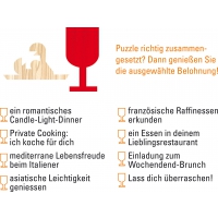 Artikel-Nr: 375109837Originelle Einladung zum Dinner for Two! Zuerst muss der / die Beschenkte das 15-teilige Puzzle lösen, dann darf er / sie die Überraschung genießen. Diese ist auf der Rückseite der Schachtel angekreuzt: Candle-Light-Dinner, Wochenend-Brunch, Private Cooking: Ich koche für dich ... Achtung! Nicht geeignet für Kinder unter 36 Monaten.