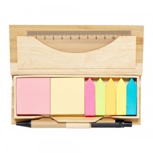 Artikel-Nr: AND734067Haftnotizset mit 220 Haftnotizen (in 2 verschiedenen Farben) und 550 Seitenmarkern (in 5 verschiedenen Farben) im Bambus-Etui. Beinhaltet ein 12 cm Lineal und Kugelschreiber aus recycelter Pappe, blauschreibend.