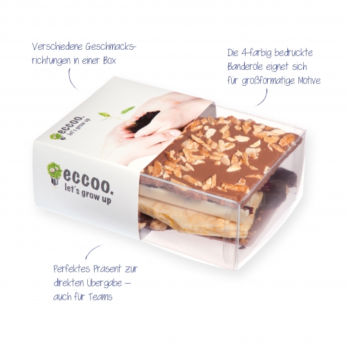 Artikel-Nr: 49450120In unserer Präsentbox S wartet meisterhaft handgeschöpfte Schokolade in vier köstlichen Geschmacksrichtungen darauf, vom Beschenkten entdeckt zu werden. Die Banderole bietet viel Platz für Ihre Werbeaussagen und kann 4-farbig im Digitaldruck gefertigt werden.