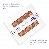 Artikel-Nr: 49450110Gourmetgeschenk gesucht? Die handgeschöpfte Premium-Schokolade im XL-Format begeistert nicht nur durch die tolle Optik, sondern vor allem durch die leckeren Kompositionen aus verschiedenen Schokoladenarten und Nüssen, Cerealien oder Mandeln. Ein Geschmackserlebnis auf höchstem Niveau. Die Banderole kann individuell gestaltet werden.