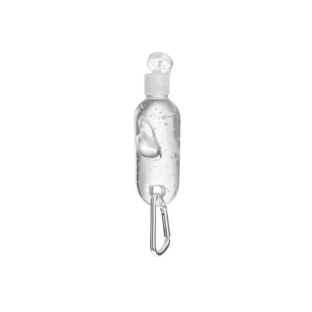 Artikel-Nr: OCBMO6130-22Handreinigungsgel in nachfüllbarer PET Flasche mit Klappdeckel und Karabiner. Füllmenge: 30 ml.